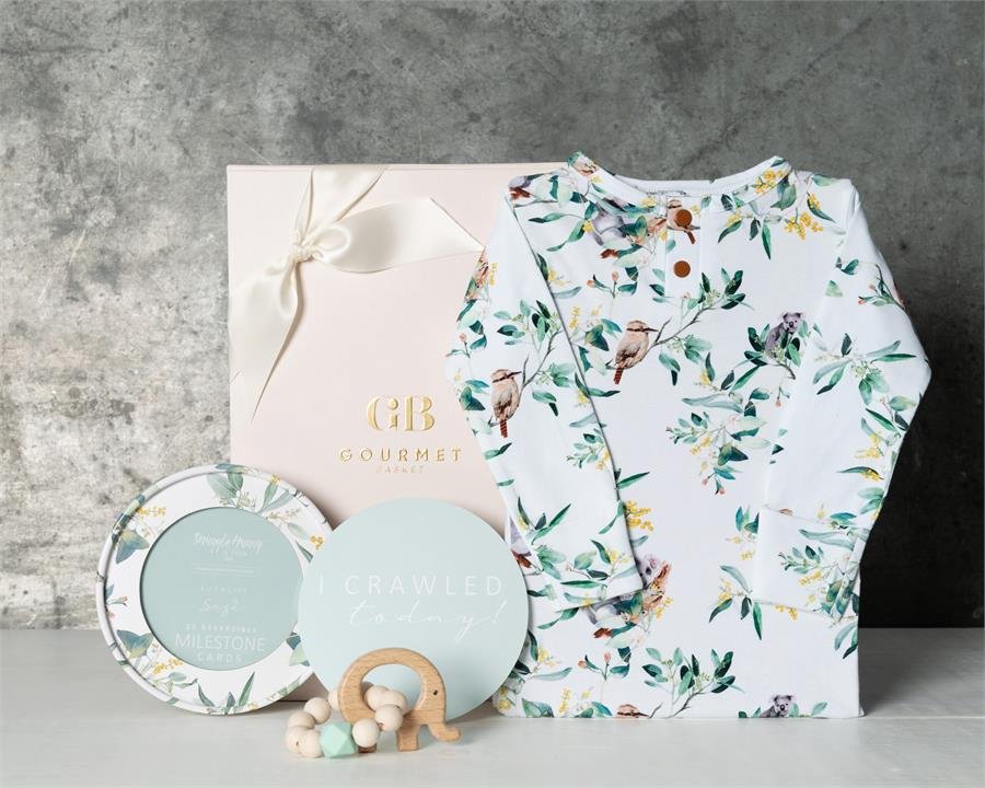 Welcome the newest member of your family with this newborn baby hamper! It includes a eucalypt pattern growsuit, milestone cards, and an elephant teether – perfect for your little one’s development. This hamper makes a great gift for any new parent.