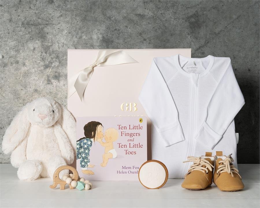 Introducing the Ten Little Fingers Baby Hamper – the perfect gift for any new parent! This hamper includes a pure baby growsuit, a soft bunny, the iconic Ten Little Fingers and Ten Little Toes baby book, a baby cookie, an elephant teether and baby shoes. The Ten Little Fingers and Ten Little Toes baby book is sure to make this special time even more memorable.