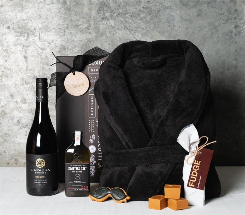 The perfect relaxation hamper for him. Relax & unwind in ultimate comfort with rejuvenating bath & a glass of pinot noir.
